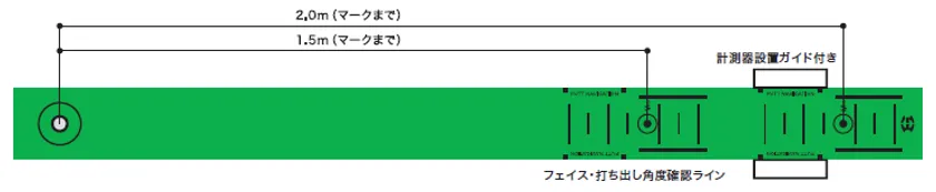 また、マットの側面には1.5mと2mの黒色のマーク付き。印が付いているので、パットで重要とされる距離感を効率的かつ効果的に養えます。「フェイス・打ち出し角度確認ライン」も付いているので、1人で練習する際にフェイスの向きやボールを打ち出す方向を自分の目で確認し、修正することもできます。