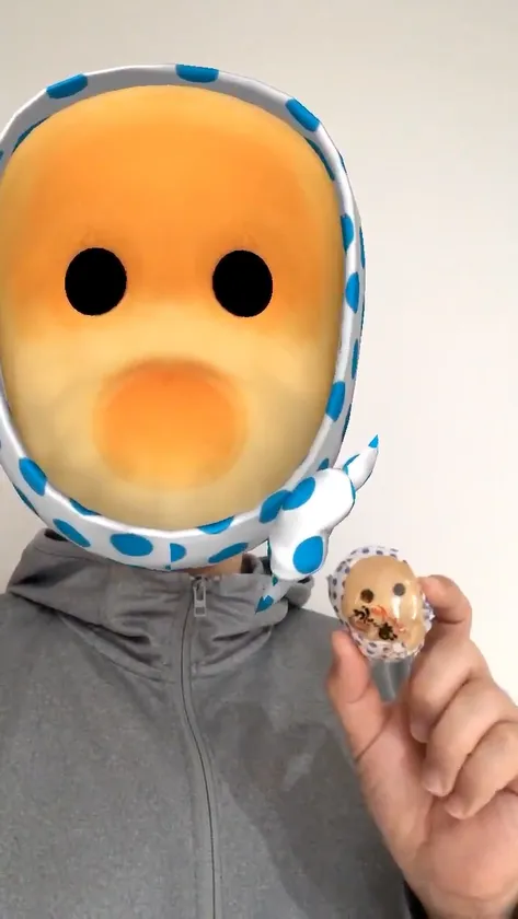 今回リリースしたARエフェクトを使うと、スマホの画面上で中浦食品のキャラクター「ドジョマン監督」になることができます。また、ドジョマン監督のほっかむりを被った姿にもなれます。