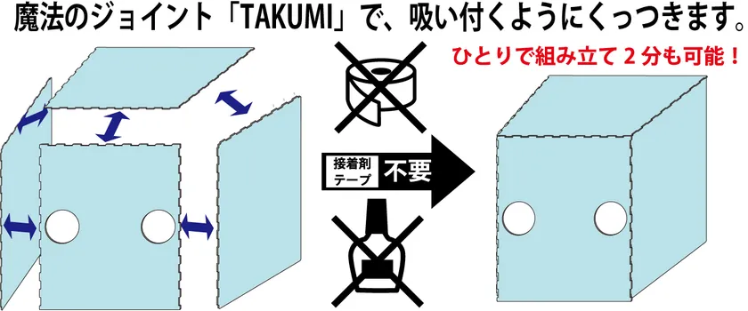チーム「TAKUMI」は、大阪・大東市を中心とした大阪下町のものづくりのチカラを合わせ、コロナウイルス対策に役立ちたいと、本ガードボックスを開発。株式会社Paddy Field(パディーフィールド)の独自ジョイント技術(特許NO.6465864号)採用で、3つの特徴は、(1)接着剤が不要 (2)コンパクトな保管 (3)地球に優しいを活用し、「硬い素材に弾力を生む」技術のTAKUMI開発を組み込み、実用化に成功。接着剤を使わずに素早く組み立てが可能な点で、使用後は簡単に分解できコンパクトに保管できます。
