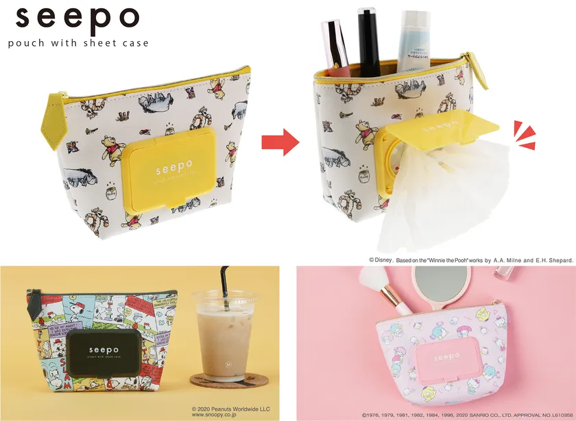 こまめな手拭きに最適!除菌シート等が簡単に取り出せる シートケースと一体化した機能性ポーチ『seepo』 くまのプーさん・スヌーピー・ハローキティなど人気キャラ全8柄
