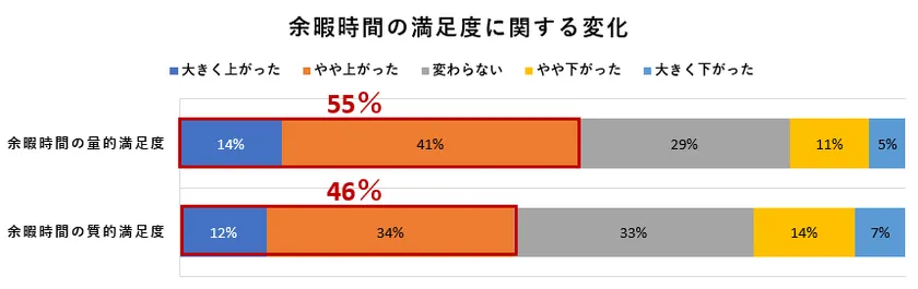 仕事の量や質、作業時間に対するマイナス影響を実感している一方で、どの属性で見ても余暇時間の満足度は大きく向上していることが分かった。特に、余暇時間の量的満足度があがったと回答する従業員は過半数となった。