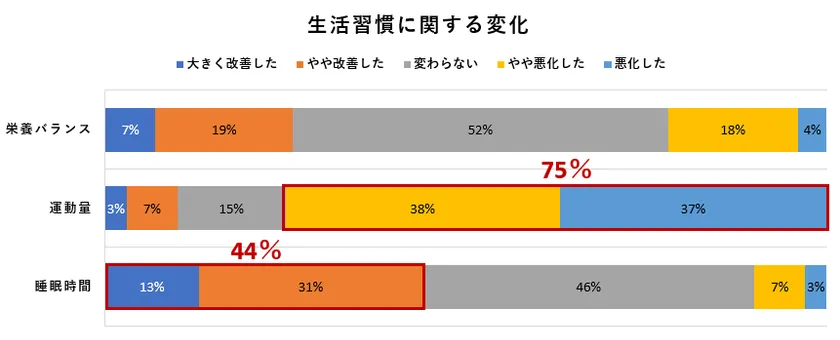 栄養バランスでは大きな変化はないという結果となったが、運動量が悪化したと回答する従業員は75%となり、運動習慣については大きく悪影響が出ていることが示唆された。ただし、外出自粛による影響も大きいと考えられる。一方で、睡眠時間が改善したという従業員は40%超となった。これは、移動時間の削減などが影響しているのではないかと考えられる。