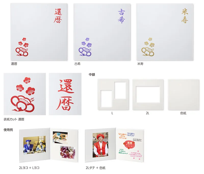 長寿のお祝い(還暦・古希・米寿)の箔飾りを施した写真台紙『長寿祝いスクウェア台紙』2Lサイズ3柄が新発売!