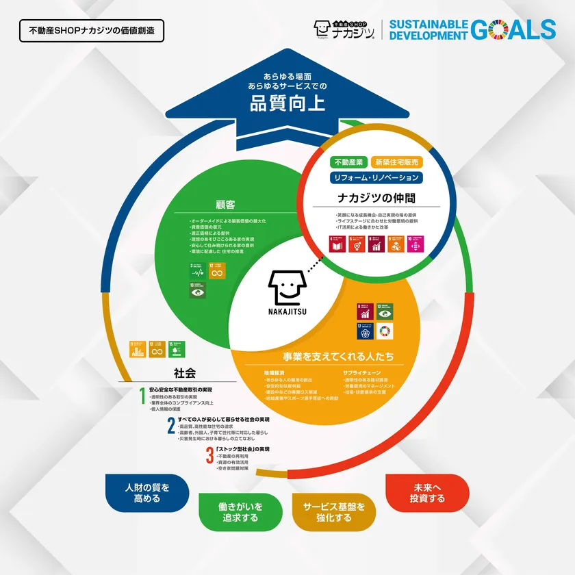 当社の事業推進にあたりもっとも重視することの一つは「品質」です。今回SDGsへ取り組むために設定した4つの優先領域「人財・働きがい・サービス・未来への投資」を通じて、社会にも優しいナカジツ品質の向上を目指します。