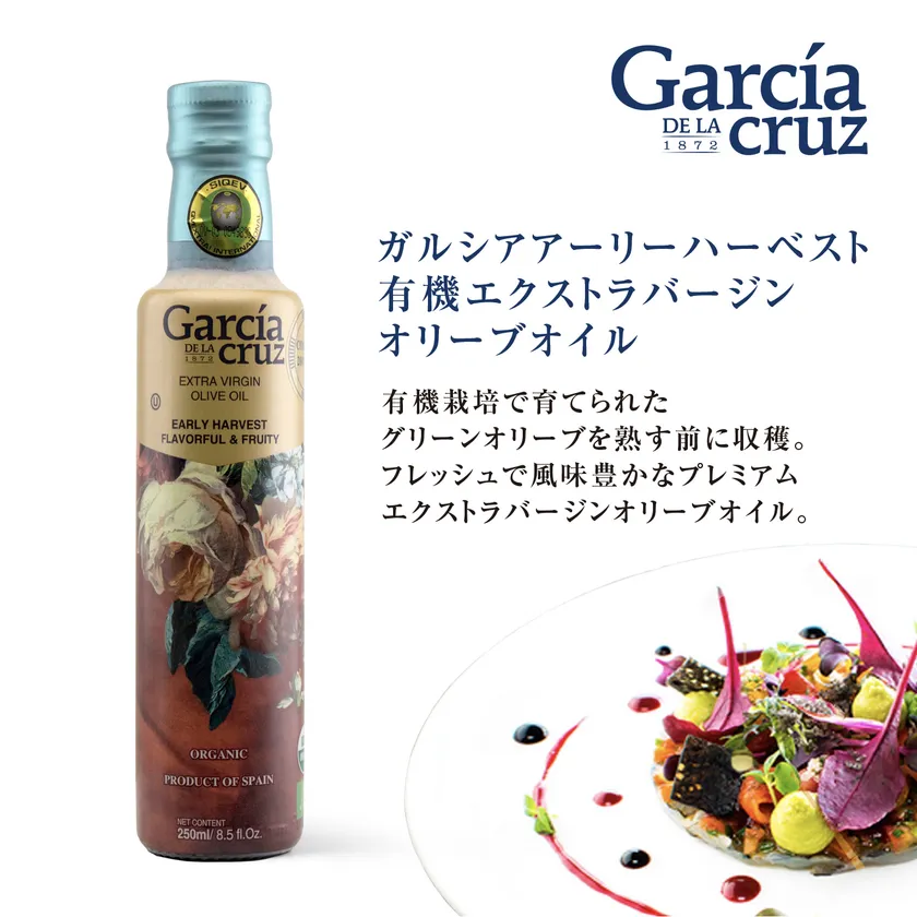 『ガルシア アーリーハーべスト有機EXVオリーブオイル 250ml 瓶』は、ガルシア社のオリーブオイルへのこだわりが詰まった特別なオリーブオイルです。有機栽培で育てられたグリーンオリーブを熟す前に収穫し搾油する事でフレッシュな風味が豊かな有機EXVオリーブオイルに仕上げました。収穫量が限られる希少な早摘み有機栽培グリーンオリーブを使用しており、生産量が少ないためオンライン限定販売となります。