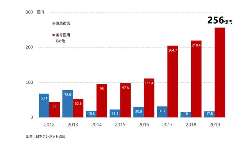 日本クレジット協会の調査によると、2019年の不正利用金額は270億円超となり、クレジットカード番号が盗用されネットを中心に不正利用される被害は増え続けています。