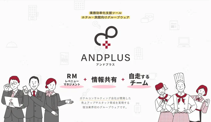「ANDPLUS(アンドプラス)」は、低価格で導入可能なホテル・旅館に特化したグループウェアです。これまで宿泊業界では、責任者である支配人に様々な情報や業務が集中し、チームとしての機能がうまく発揮できていないことで、売上の低迷や人材不足といった課題がありました。「ANDPLUS(アンドプラス)」は日々の業務ノウハウを一元化しスタッフ全員で共有することにより業務効率化と人材育成をお手伝いします。