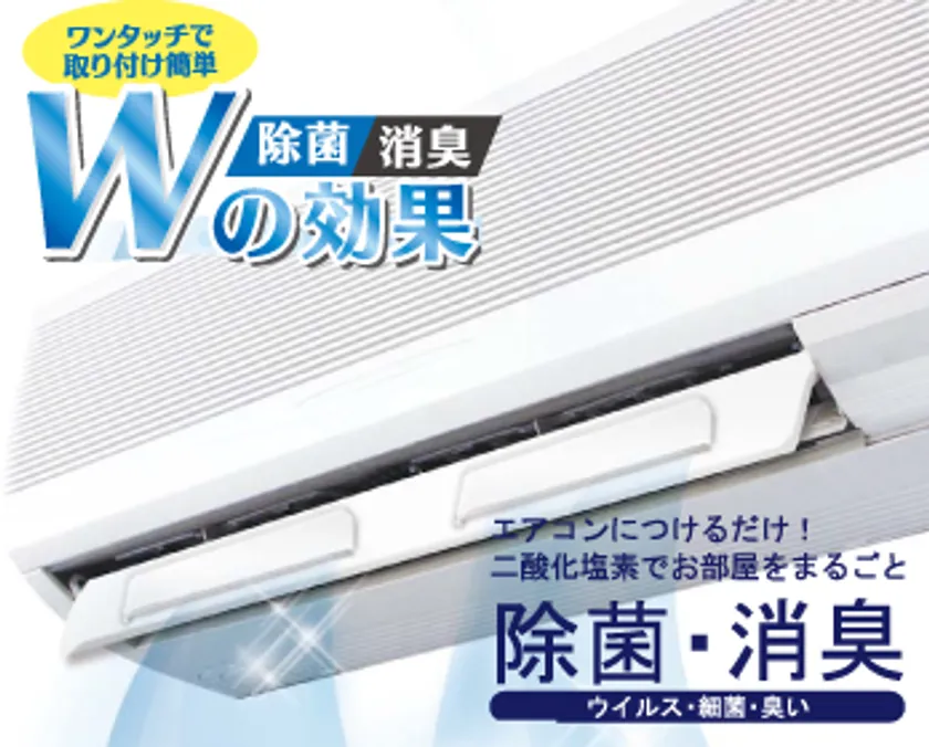 設置は、エアコンの吹き出し口のルーバーに貼り付けるだけ。エアコンの気流に二酸化塩素をのせて空間をまるごと除菌・消臭します。二酸化塩素は、空気より重い特性があるため、エアコンにつけることで効率よく拡散します。家庭用エアコン、業務用エアコンでも取り付け可能です。二酸化塩素はラジカルの一種で強い酸化力を持っていることからウイルス除去、除菌、消臭、抗カビ等に対して、優れた働きがあります。