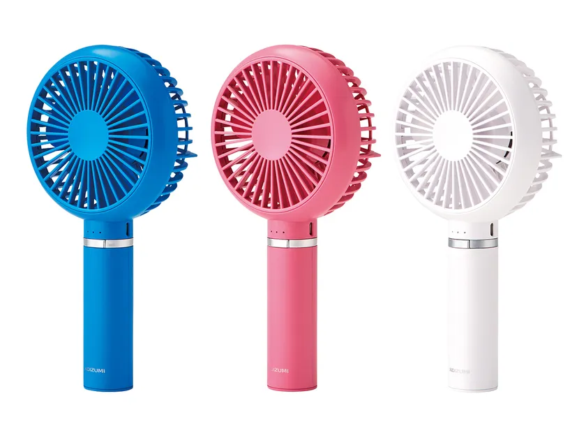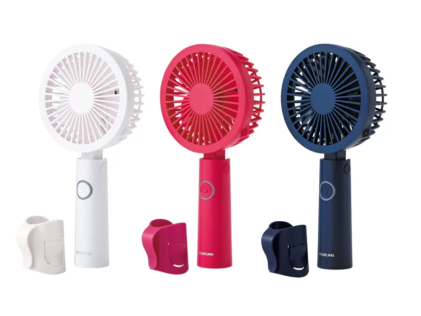 理美容器具などの自社商品の企画・開発と、国内外のメーカーブランド商品の販売代理店業を展開する小泉成器株式会社は、ミニサイズの携帯ファン「ハンディファン」を2種(KPF-0903/P・A・W)、(KPF-0904/P・A・W)と、置いても挟んでも使用できる「クリップ扇風機」を2種(KMF-1107/T・A)、(KMF-0608/P・A)の計4種を6月より発売開始しましたので、お知らせします。USB充電式のコードレスのため、[通勤、オフィス] [お出かけ先] [室内でのパーソナル空間]など、さまざまなシーンで快適に風を感じていただくことができます。