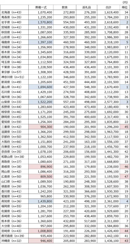 葬儀一式費用が高い都道府県・低い都道府県(都道府県別表組)
