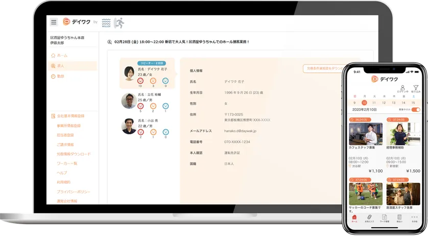 『デイワク』は、スキマ時間に働きたい人と、必要な時に必要な人材を活用したい企業をマッチングするワークシェアアプリです。システムの管理画面から即時に求人情報を登録・掲載することができ、「いつでもカンタンに」人材を採用することが可能です。