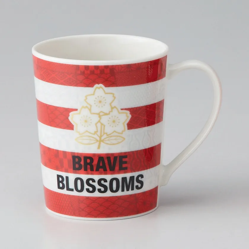 ラグビー日本代表ジャージーの赤白ボーダーをベースに、桜のエンブレムと「BRAVE BLOSSOMS」の文字で装飾したマグ。