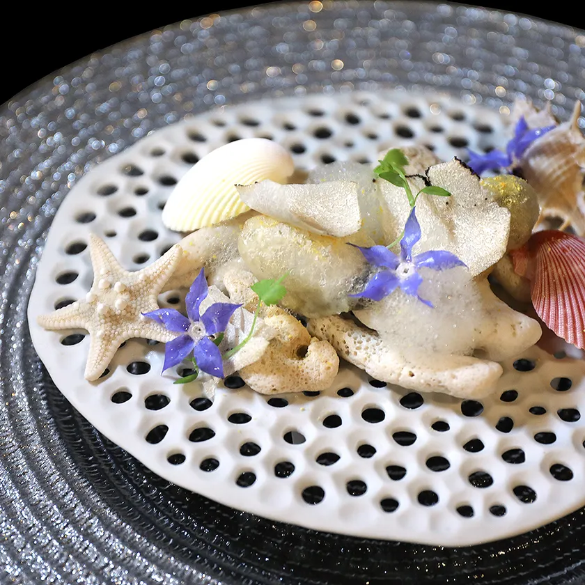 提供しますお料理は、真空圧を使った『ガストロバック調理』や、食材をフリーズドライにできる『真空乾燥機』、蒸留装置の『ロータリーエバポレーター』、高速で食材を冷却できる『ショックフリーザー』など様々な機器を使ったアプローチによる、和洋中のジャンルに収まらないイノベーティブ・フュージョン系の創作料理です。