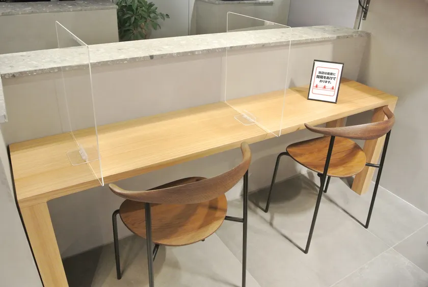 ▼アクリル製の新型コロナウイルス対策用卓上仕切りを飲食店のカウンターに応用した例。店舗や施設の環境に応じて製品を組み合わせることができる。
