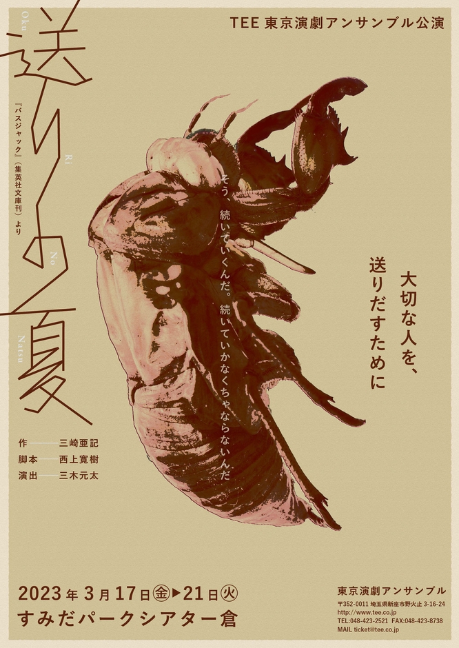 東京演劇アンサンブルでは、『となり町戦争』『失われた町』などの代表作で高く評価されている作家 三崎亜記原作による『送りの夏』の上演をいたします。独特の世界観をもった作者の魅力あふれる小作品を初めて舞台化します。児童・青少年演劇の脚本で定評のある劇作家 西上寛樹を迎え、東京演劇アンサンブルの成長著しい三木元太が演出をします。近しい人の死を受け入れられない人たちが、どう受け入れていくかという物語は、現実離れしているようで、誰しもが思い当たるような物語かもしれません。