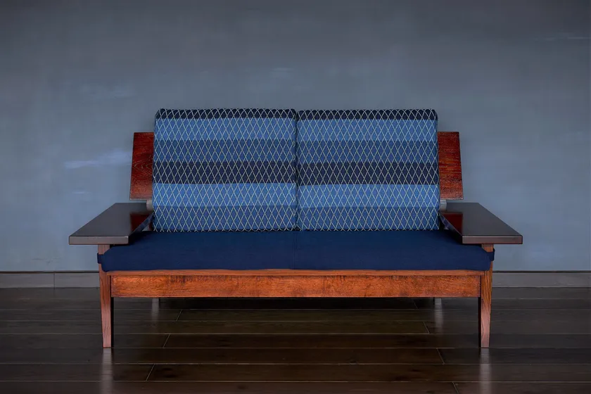 日本で古くから用いられ、現代でも広く愛される藍染めの布。そして、日本の森で時間をかけて育った楢(ナラ)に漆塗りを施した、美しいソファが完成しました。