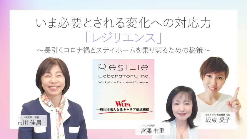 このたび、育児女性の社会復帰を支援している一般社団法人女性キャリア推進機構(本部:東京都文京区、代表理事:坂東 愛子、以下 当社団)は、レジリエ研究所とコラボし、長引くコロナ禍やステイホームから起こるストレス反応を軽減できるよう解説した動画を公開いたしました。動画は、当社団代表理事 坂東 愛子と、ストレス対応に大きく寄与するレジリエンス研究では日本における第一人者のレジリエ研究所所長・医学博士の市川 佳居氏と同研究所主任研究員・臨床心理士の宮澤 有里氏の3者による対談となっております。