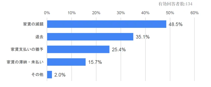 家賃の滞納や、減免・遅延の相談、もしくは退去の通告などが発生した。