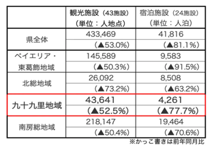 千葉県全体の3月宿泊客は8割減。九十九里地域においても、千葉県で2番目に落ち込み77.7%減。また、観光客は半減。九十九里地域においては52.5%に落ち込み、観光・宿泊ともに集客が厳しい実態となっています。
