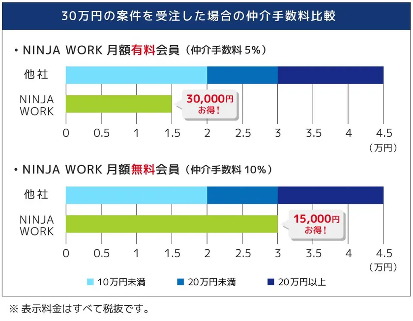 そんな創業期の経営者やフリーランスの方々に資金力をつけていただきたいという想いから、NINJA WORKのクラウドソーシングサービスは、掲載料で運営し直接取引を実現!直接取引だから仲介手数料もかかりません。法人の方も個人の方もご利用いただけます。