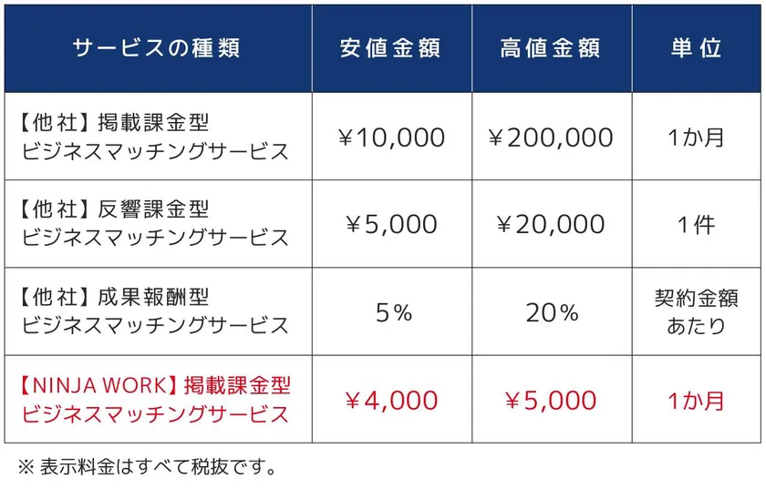 創業期は何かと費用を抑えたいもの。そんな創業者の方に、ビジネスマッチングサービスの掲載料金を業界最安値でご提供。NINJA WORKのビジネスマッチングサービスは、月額¥5,000で利用し放題!気軽に利用できるだけでなく、高いPR効果も見込めます。