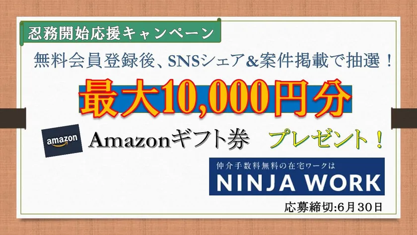 アフターコロナの“働き方改革”を支える 「創業者支援総合サービスNINJA WORK」6/1(月)よりスタート! サービス開始を記念して 「Amazonギフト券プレゼント!SNS拡散キャンペーン」 第一弾開催中!