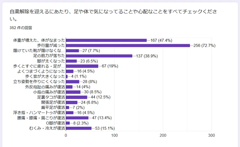 しかし外出の減少で靴を履くことが減り、それら足の悩みが復活したことが浮き彫りになりました。当社では2020年5月に「自粛期間中における体の変化に関する意識調査」を実施(当店で購入履歴がある40代~70代の女性352名:詳細は付属資料をご覧下さい)、そこで明らかになったのは、真面目にステイホームをした方ほど体力低下に不安を感じ、実に40%以上の方が靴を履かなくなったことが原因で、足トラブルが復活していたことです。
