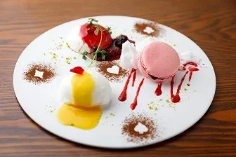 フロマージュブランのムースとフランボワーズのマカロン、瀬戸内レモンシャーベットの3種の味わい豊かなデザート。