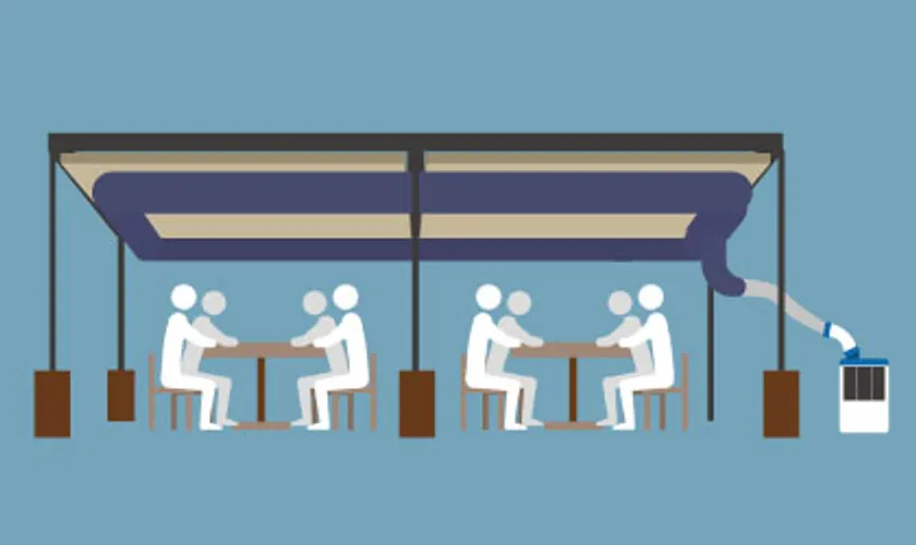 屋外ではテントに取りつけて冷却エアを供給し、多人数を同時に熱中症から守ります。