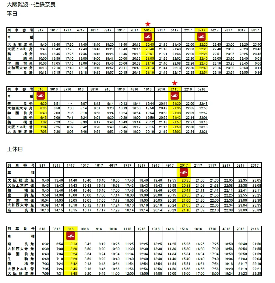 近鉄奈良発 6時30分、21時30分(増発)
