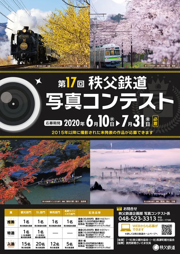 秩父鉄道株式会社(本社:埼玉県熊谷市、代表取締役社長:大谷 隆男)では、第17回秩父鉄道写真コンテストを6月10日(水)から開催します。4つの部門で作品を募集し、入賞作品の中から来年のカレンダーを作製します。詳細は、下記のとおりです。