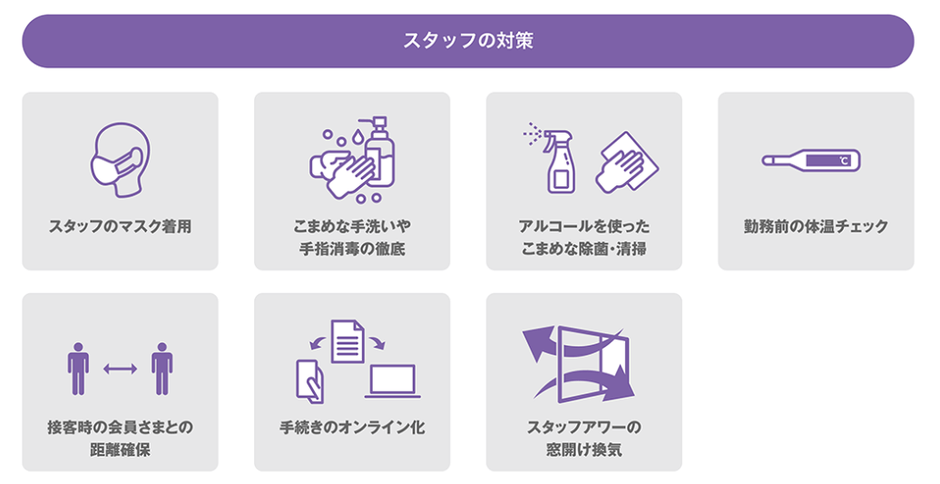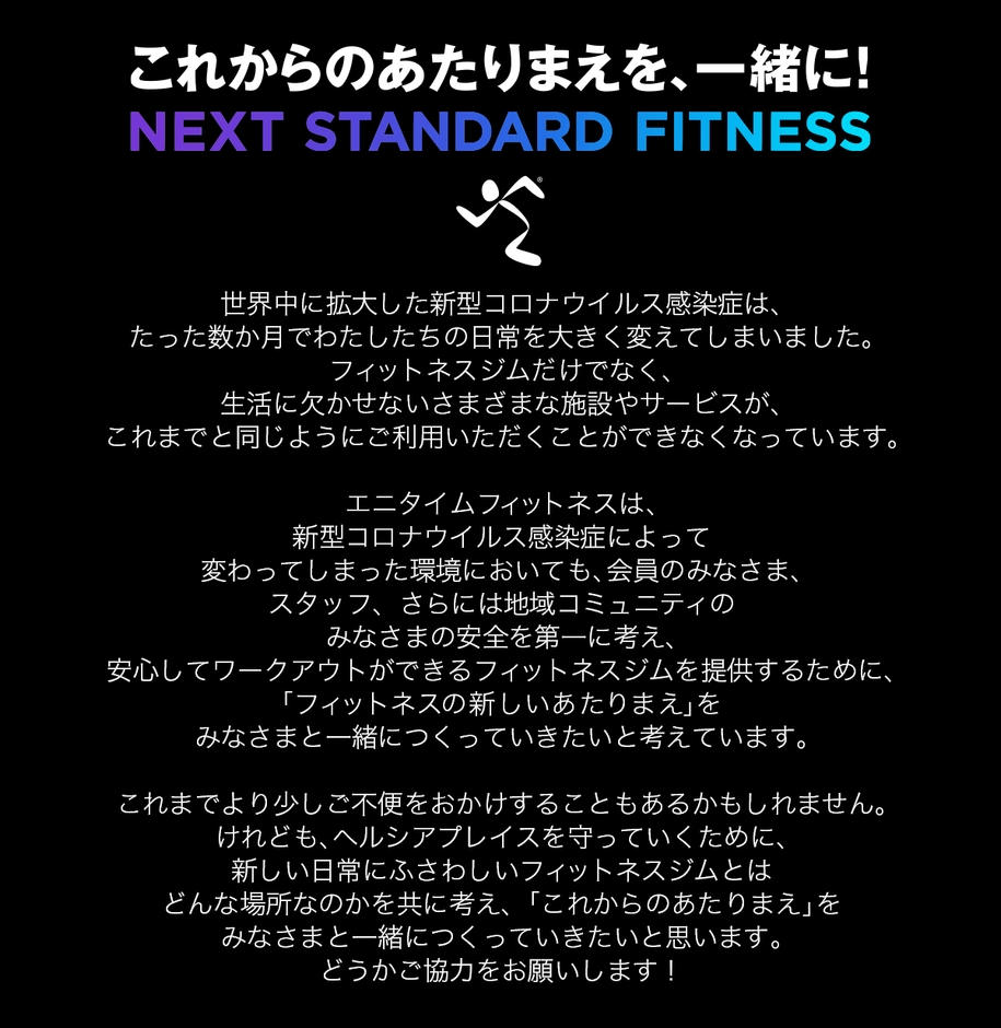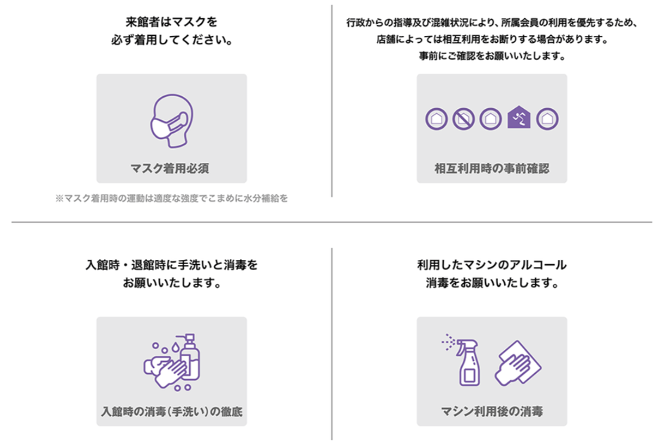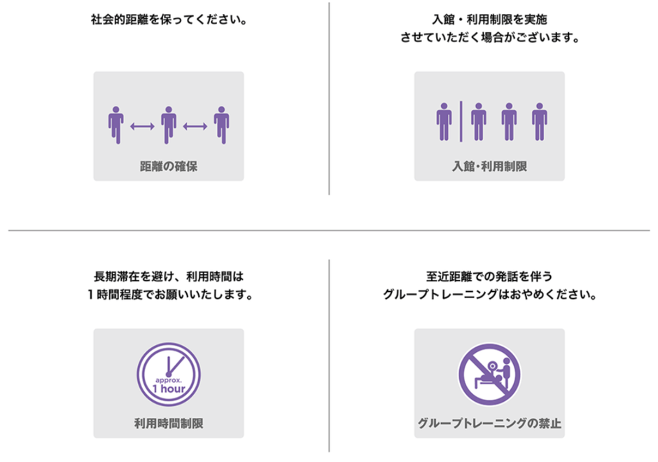 営業再開にあたり、運営面および施設面において感染防止のための対策を行うとともに、利用者に向けて、マスクの必着、入館制限、利用時間制限などの新たな利用ルールを発表しました。新しい日常における安全なフィットネスジムの利用には、利用者の協力が欠かせないとして、「NEXT STANDARD FITNESS これからのあたりまえを、一緒に!」というメッセージとともに、安全・安心・清潔・快適なフィットネスジムの継続のために協力をお願いしました。