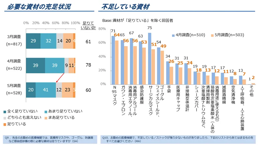 3月、4月に行った調査結果と比較するかたちで、診療現場で働く医師の実感を掴み、医療機関の対応状況、医療資材の不足状況、医師の意識の変化を見る。