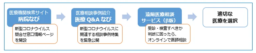 弊社が運営する医療機関検索サイト「病院なび」( https://byoinnavi.jp/ )は、身体に不調を抱え受診を希望する患者さんを中心に月間ユーザー1,500万人以上、年間換算では日本の総人口を超える方にご利用を頂いております。そのなかには新型コロナウイルスへの感染が疑われたり、不安を感じておられる患者さんのご利用も多くあります。弊社では、医療崩壊を未然に防ぎ、また患者さんを二次感染などから守るべく各フェーズで次のような取組みを行っています。