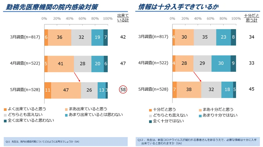 資材充足状況がやや改善されてきたこともあってか、勤務先医療機関の院内感染対策についても「よく出来ている」または「まあ出来ている」との回答が、3月調査、4月調査の4割台から10ポイント以上上昇し、58%となりました。情報の入手についても、「十分だと思う」または「まあ十分だと思う」との回答が45%となり、4月以前に比べ10ポイントあまり上昇しています。(図2)