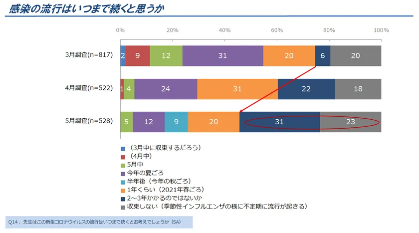 まだ不十分とはいえ、医療・検査体制に改善傾向が見られるなか、臨床現場の医師は感染の収束時期についてどのように考えているのでしょうか。
