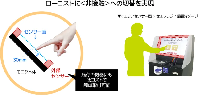 プラネットがリリースする「<エリアセンサー型>非接触ソリューション」は、店舗はもちろん、様々なシーンで活用されている既設のタッチパネル端末をディスプレイサイズに合わせた専用アタッチメントを取り付ける事で『非接触仕様』にすることができます。