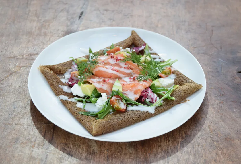 そば粉のガレット生地にサーモンとアボカド、さらにフレッシュな野菜をたっぷりと。クリームチーズをトッピングしレモンドレッシングで味の一体感が生まれます。ブランチにぴったりな一皿。