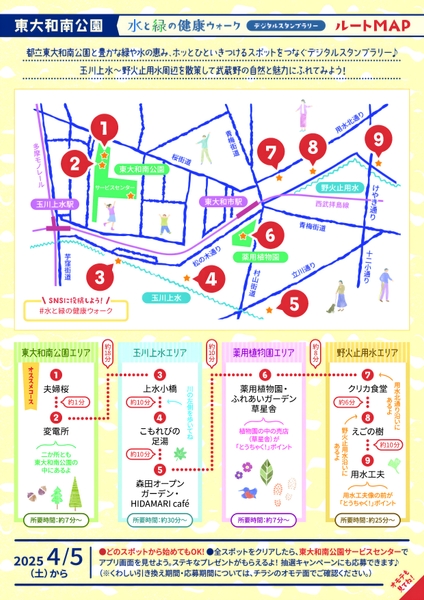 園内から始まり、玉川上水と野火止用水沿いをつなぐ水の恵みや豊かな緑に囲まれた美しい景観を散策しながら、武蔵野の自然が楽しめるデジタルスタンプラリーです。