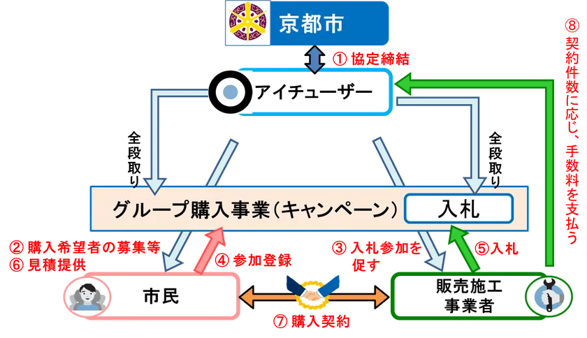 多くの人が参加することでグループ購入が可能となり、販売施工事業者から京都市民に向けた特別な割引価格を得ることができます。市場価格の約20%割安な落札を目指します。