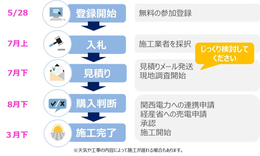 事前に購入希望者の参加登録、ならびに販売施工事業者の入札参加意向を募り、具体的なスケールメリットを把握したうえで入札によって価格を競い合う仕組みです。以下の通りの事業日程となります。