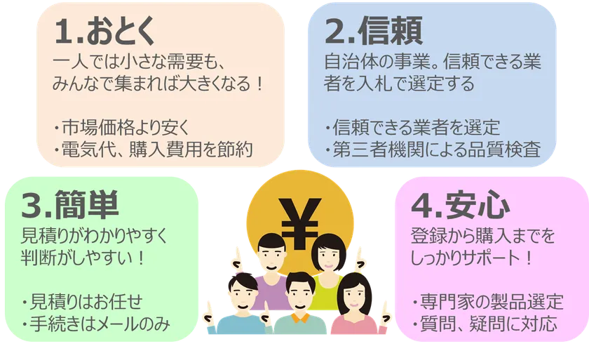 自治体が機会を提供する事業で信頼感があります。また、事前見積書で製品・価格、初期費用の回収年数を分かりやすく説明、納得したうえで購入の判断ができます。