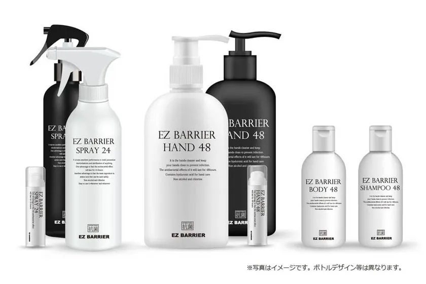 「EZ BARRIER series」は、植物性由来のアミノ酸成分で「抗菌・除菌・消臭」。第三者機関によるウイルス性試験において、有効であることが認められています。また、毒性や皮膚刺激などの試験においても安全評価。アンモニアやホルムアルデヒド等の消臭効果もあり、手や身体、身の回りのモノを簡単に「抗菌・除菌・消臭」します。