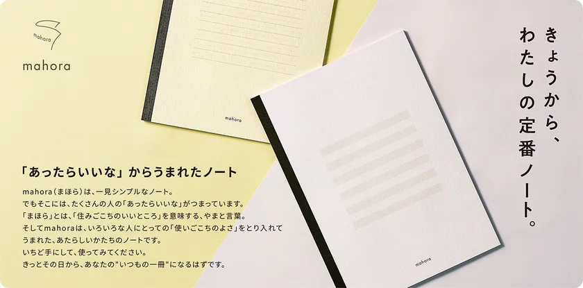 ※『mahora(まほら)』とは「住みやすい場所」「素晴らしい場所」を意味するやまと言葉。「使いごこちのいいノート」でありたいという願いから名付けました。