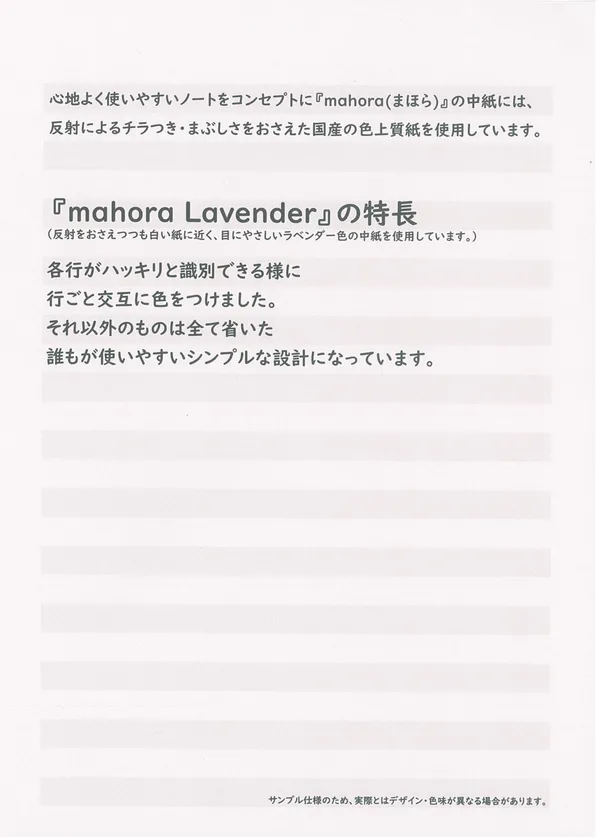 また、6月1日からは、目に優しく行の識別がしやすいmahoraノートの中紙と素材感あふれる表紙をセットにしたサンプルをご請求いただいた方に送料無料でお送りし、実際に確認していただいたのちご注文いただけるようにいたしております。
