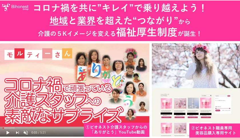 兵庫県、大阪府を中心に全国で130事業所以上の医療・介護・障がい福祉事業を展開するビオネストグループ(グループ本社 株式会社ビオネスト:兵庫県神戸市、代表取締役:石野 政道、以下 ビオネストグループ)は、緊急事態宣言下の5月上旬に株式会社モルティー(本社:栃木県宇都宮市、代表取締役:藤岡 由起子、以下 モルティー)から支援物資として「マスク300枚」に加え「110万円相当の美容品」を贈られたことをキッカケに、職員の6割以上を占める女性職員を対象とした“介護で働きながらキレイに”を叶える福利厚生制度を設立しました。