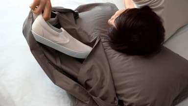 ○枕カバーと避難グッズ収納カバーをボタンで連結して使う防災用品。