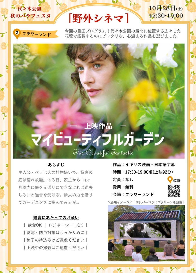 今季のテーマは、「公園だからできる」。昼は広大な森林公園ならではのワークショップや、2つのバラスポットを巡るガイドツアー、夜には「野外シネマ」が登場し、草の上でゆったり映画鑑賞ができます。代々木公園らしい、のびのびとしたバラフェスタをお楽しみください。