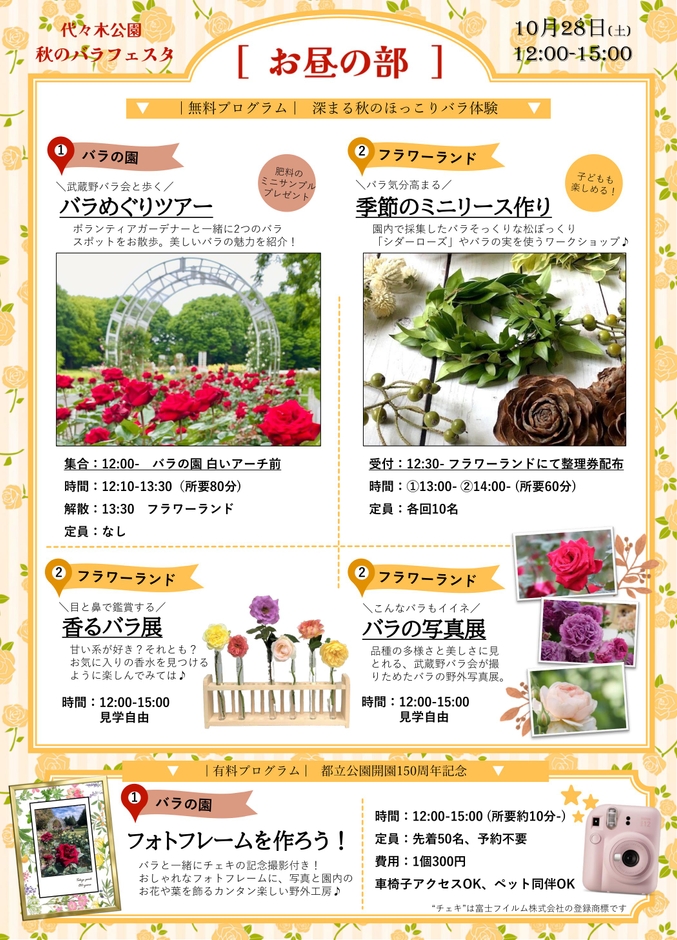 内容:バラと一緒にチェキの記念撮影付き!おしゃれなフォトフレームに、写真と園内のお花や葉を飾るカンタンで楽しい野外工房です♪