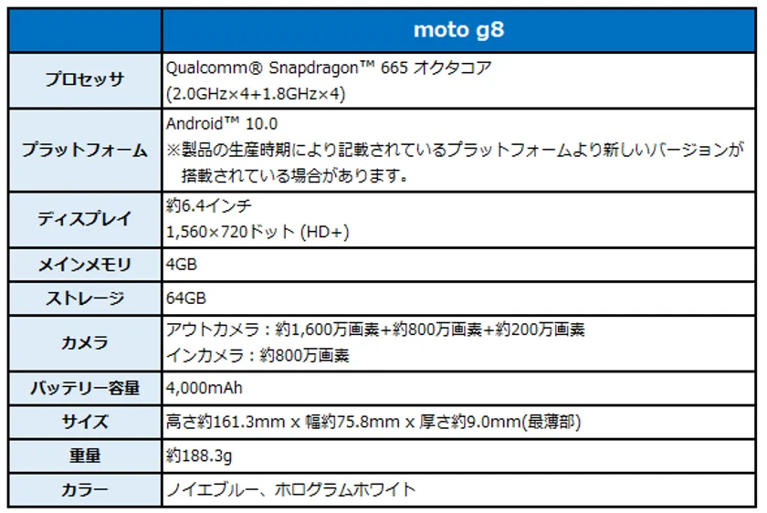 「moto g8」は、前機種の「moto g7」からCPU・カメラ・バッテリーの性能が強化された、BIGLOBEモバイル初のAndroid 10を搭載したモデルとなります。